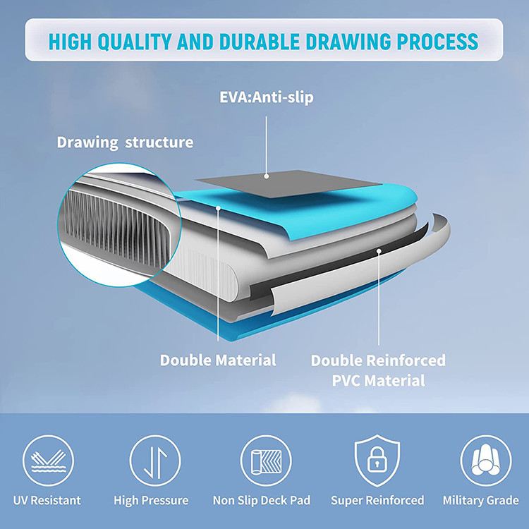 - [Wysokiej jakości i trwałe deski wiosłowe Stand Up]Ta deska do wiosłowania przyjmuje nowy, przyjazny dla środowiska materiał EVA z dobrą amortyzacją, odpornością na uderzenia i wodoodpornością.Po zoptymalizowaniu wielowarstwowej struktury warstwy szwów i struktury ściegu kroplowego, powietrzna deska surfingowa ma dobre tarcie, aby zapobiec poślizgowi.